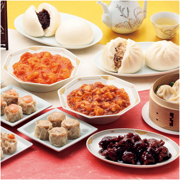 重慶焼売35g×4、海老焼売35g×4、蟹焼売30g×4、野菜焼売30g×4、いか焼売30g×4、小籠包30g×4、海老のチリソ-ス180g×2、四川麻婆豆腐180g×2、香醋酢豚160g×2、肉まん120g×2、あんまん120g×2
