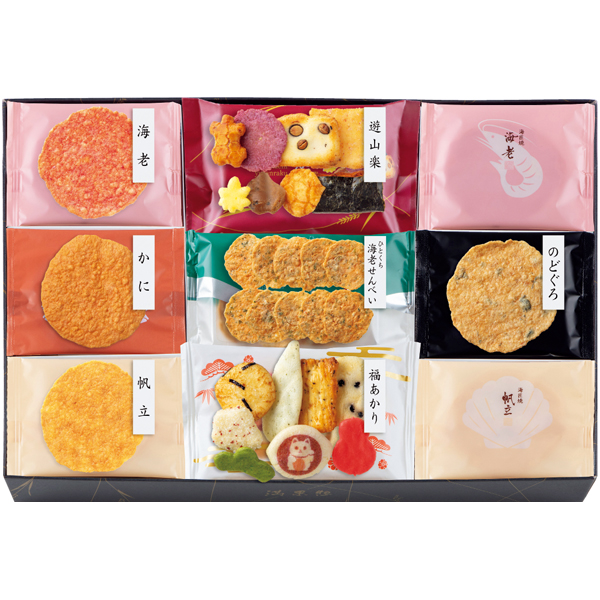 海匠焼(海老・帆立)各10、海匠焼(かに・のどぐろ)各5、ひとくち海老せんべい2、遊山楽2、ふきよせ福あかり2 7種36袋入