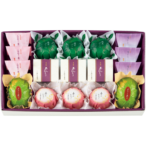 とろりとなめらかなこし餡に、やわらかい小餅を入れた「あんとろり」と、苺ソースやメロンの果肉をたっぷり使った和菓子など、あんと果実をお楽しみいただける詰合せです。