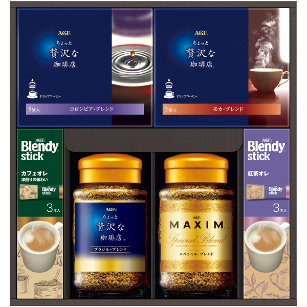 ちょっと贅沢な珈琲店 ブラジルブレンド65g、マキシムスペシャルブレンド65g、ちょっと贅沢な珈琲店 ドリップコーヒー(コロンビアブレンド・モカブレンド 各5P)、ブレンディスティック(カフェオレ・紅茶オレ 各3P)