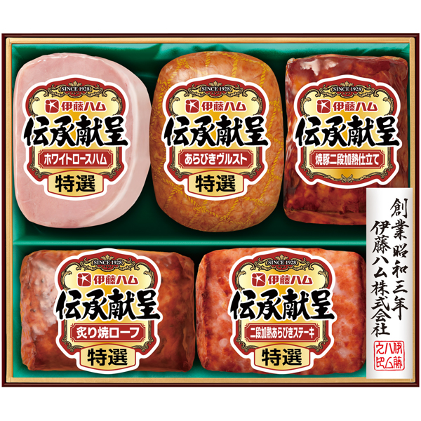 特選ホワイトロースハム180g、特選あらびきヴルスト160g、焼豚二段加熱仕立て160g、特選炙り焼ローフ160g、特選二段加熱あらびきステーキ110g