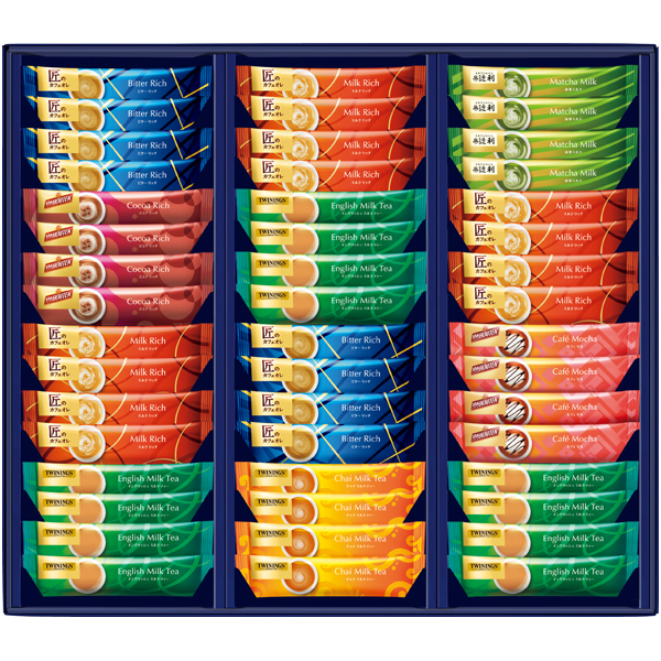 ココアリッチ・カフェモカ・チャイミルクティー・抹茶ミルク 各4、ミルクティー・ミルクリッチ 各12、ビターリッチ8
