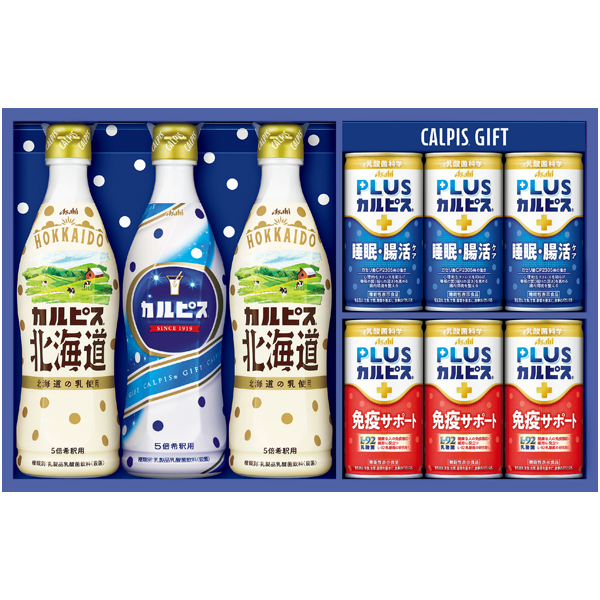 カルピス(ギフト用)470ml、カルピス北海道470ml×2、「PLUSカルピス免疫サポート」ギフト用(缶)190g×3、「PLUSカルピス睡眠・腸活ケア」ギフト用(缶)190g×3