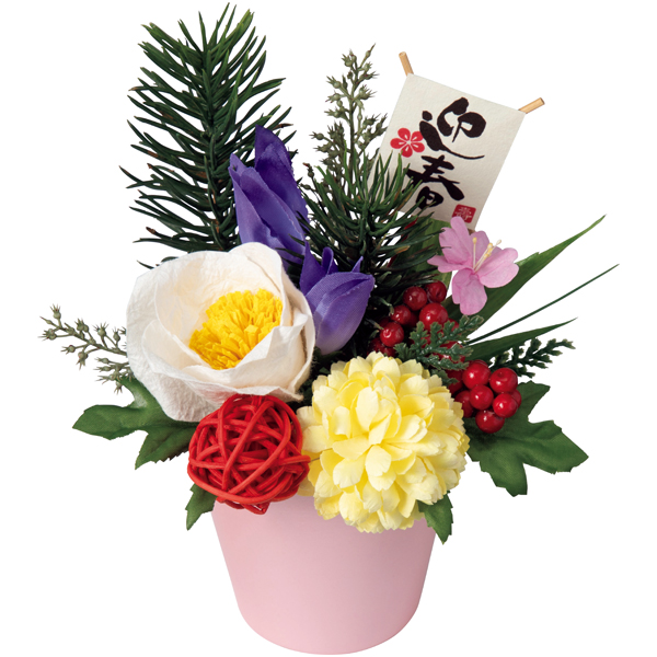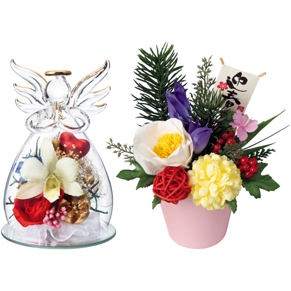 ジュエル・フルール(天使のガラスドーム(高さ約11cm)、ドライフラワー(デンファレ、デルフィニウム)、プリザーブドフラワー(バラ、カスミソウ、小花、ブルーアイス)、木の実、ハートピック)、和紙の花(陶器鉢(鉢直径6cm、高さ約16cm)、和紙の花(白椿、桜、菊、葉2)、造花(リンドウ、松、笹、木の実、グリーン)、凧ピック、ラタボール) ※北海道配送可