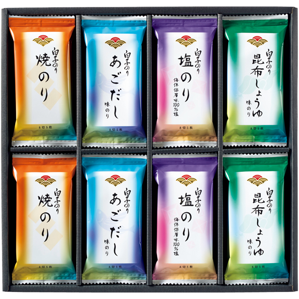 あごだし味、塩味、昆布しょうゆ味、焼のりの彩り豊かなこだわりのりギフトです。