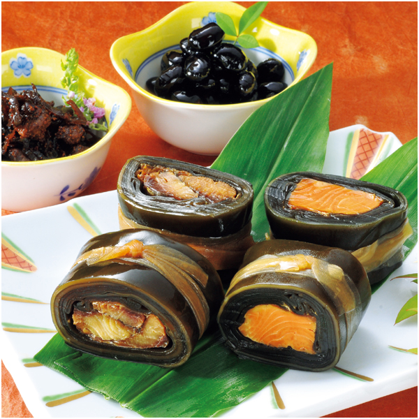 紅鮭昆布巻110g、にしん昆布巻110g、わかめの松前漬70g、たたきごぼう70g、たらこ昆布60g、黒豆100g