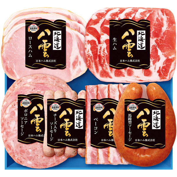ベーコンスライス39g、肩ロース生ハム30g、チーズ入りソーセージ95g、ボロニアソーセージ56g、ロースハムスライス48g、馬蹄型ソーセージ128g