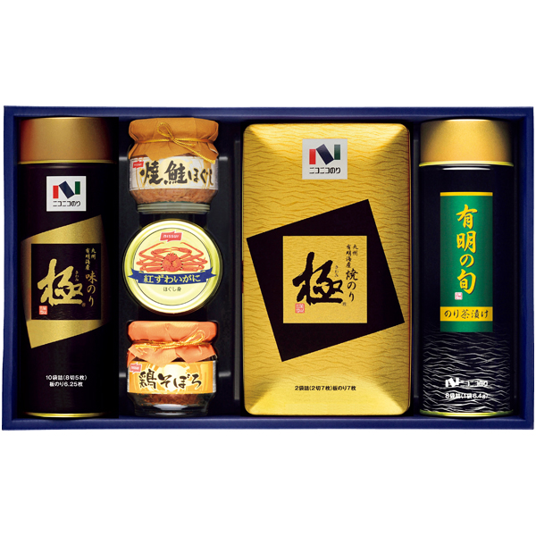 のり茶漬8袋、味のり10袋詰(8切5枚)、焼のり2袋詰(2切7枚)、紅ずわいがにほぐし身55g、焼鮭ほぐし50g、鶏そぼろ50g