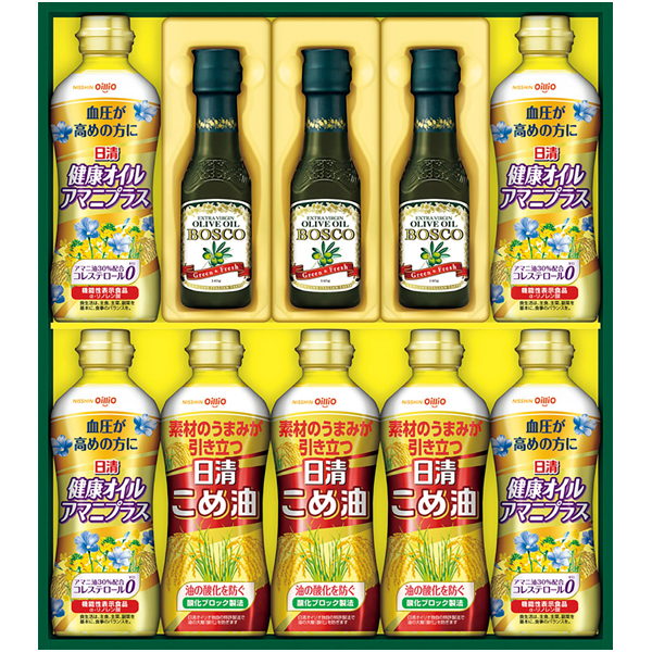 豊かな香りと味わいのBOSCOオリーブオイルと日清健康オイルアマニプラス、日清こめ油を詰合せたギフト。