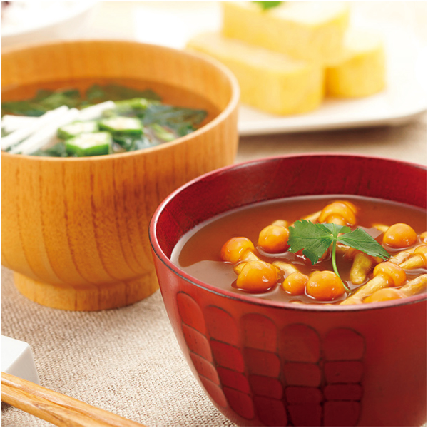 国内産の鰹節粉末と昆布粉末を使用したおみそ汁と、白だし、昆布だしを使用した上品な風味のお吸い物です。