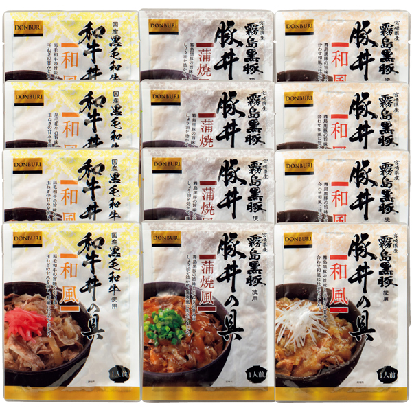 黒毛和牛丼の具(和風)100g×4、霧島黒豚丼の具(和風100g×4、蒲焼風100g×4)