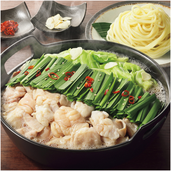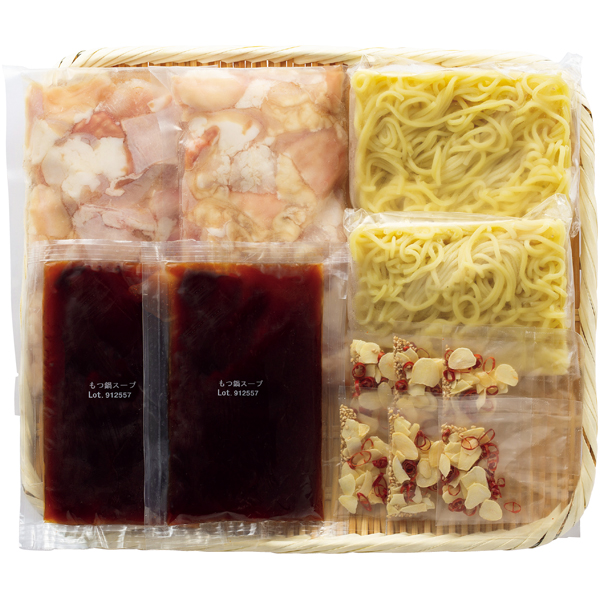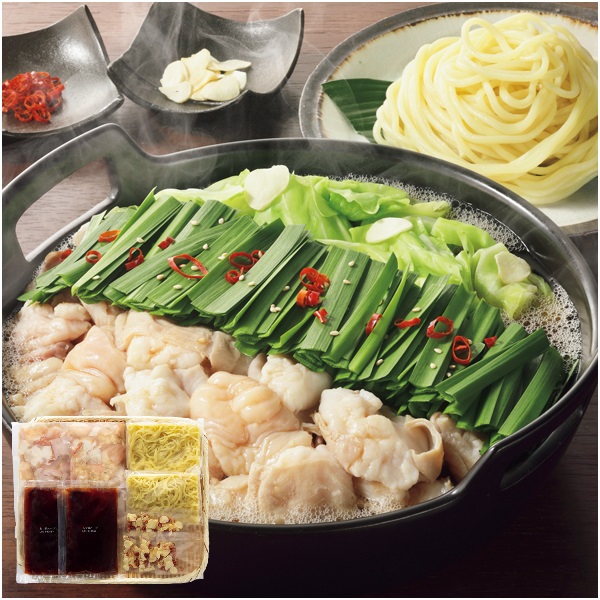 ぷりぷりの食感の和牛もつを醤油スープが引き締めるもつ鍋セット。ソフトでコシのあるちゃんぽんが締めの満足を引き立てます。