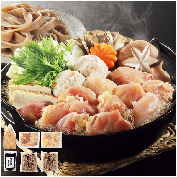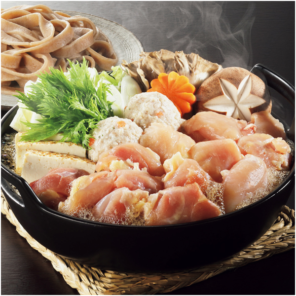 名古屋コーチン260g(もも肉130g、むね肉130g)、名古屋コーチン生つみれ150g(各原料:肉/愛知県産)、全粒粉入りうどん220g×2、すき焼わりした180g