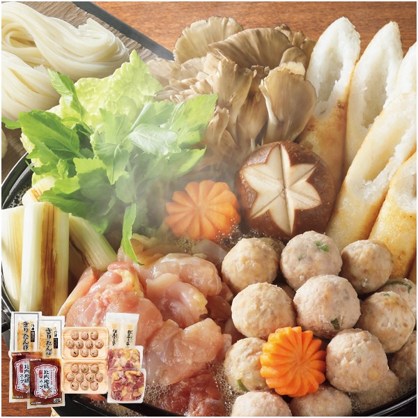 秋田県産比内地鶏100g×2、比内地鶏スープ200g×2、稲庭干饂飩80g×2、きりたんぽ140g×2、比内地鶏入り生つくね140g×2(各原料:肉/国産)