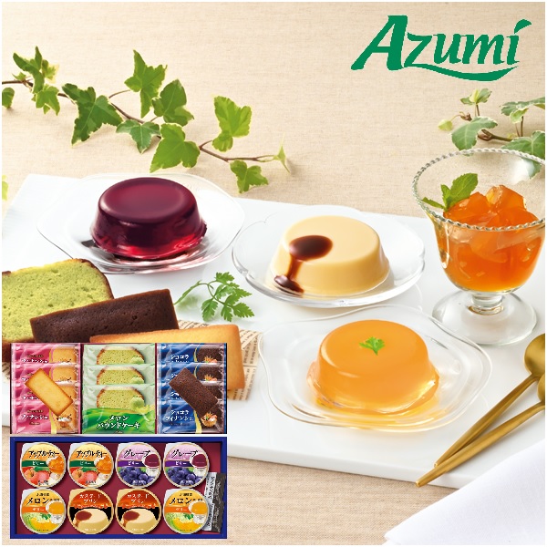 カスタードプリン(ソース付)・北海道産メロンゼリー・グレープゼリー・アップルティーゼリー 各2、メロンパウンドケーキ3、フィナンシェ2種 各4