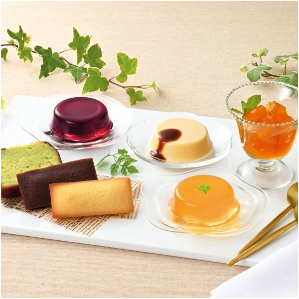 プリンやゼリーなどのスイーツとフィナンシェなどの焼き菓子の詰合せです。