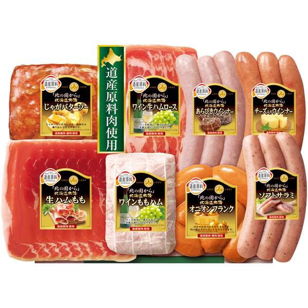 ワインももハム130g、もも生ハム65g、ワイン生ハムロース35g、じゃがバターソー180g、オニオンフランク180g、ソフトサラミ75g、あらびきウインナー(帆立エキス入り)75g、チーズ入りウインナー75g