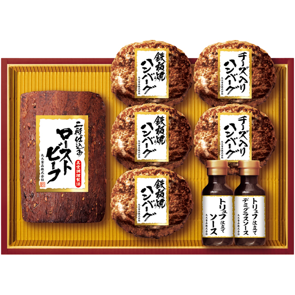 ローストビーフ(原料:肉/オーストラリア又はアメリカ又はカナダ産)180g、鉄板焼ハンバーグ115g×3、チーズ入りハンバーグ115g×2、デミグラスソース90ml、トリュフ仕立てソース90ml