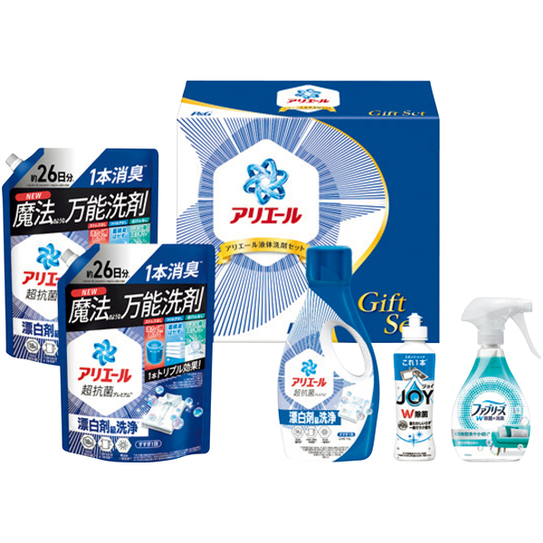 アリエールジェル(本体700g、詰替用超特大サイズ625g×2)、ファブリーズW除菌370ml、除菌ジョイコンパクト170ml