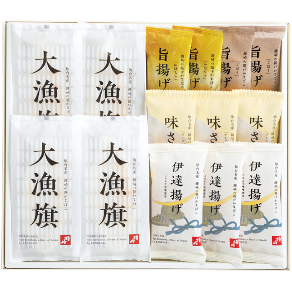 大漁旗90g×4、味ささ(チーズ)25g×3、旨揚げ(ごぼう・かぼちゃ)各40g×2、伊達揚げ45g×3