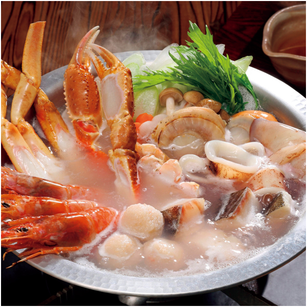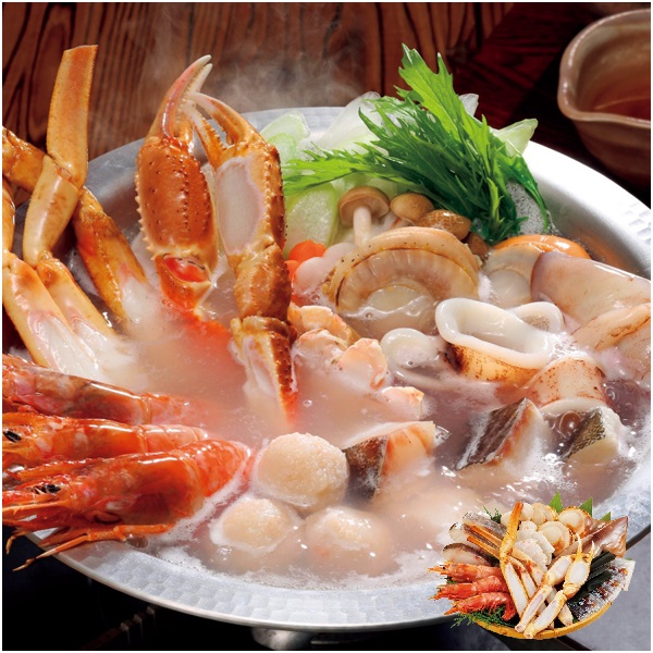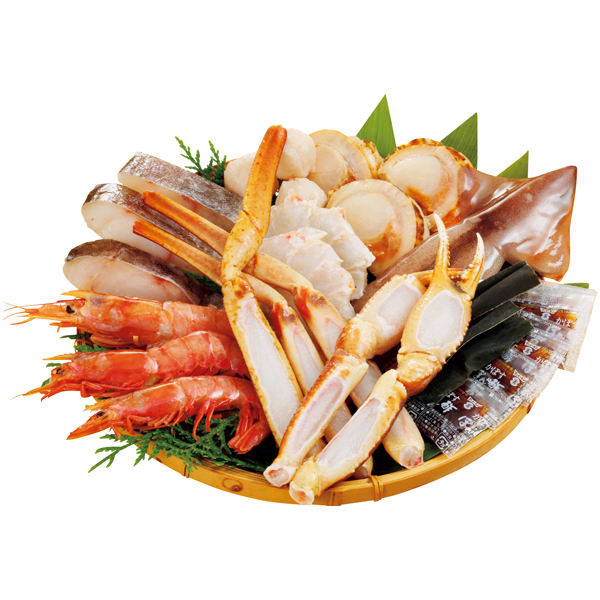 生ずわいがにカット(爪付き脚、脚、肩)(ロシア産原料)300g、真だら切身(北海道産原料)3(計120g)、つぼ抜きいか(アルゼンチン又は中国産原料)60g、ボイルほたて(北海道産原料)3(計130g)、かに入りだんご3(計45g)、赤えび(アルゼンチン産原料)3(計90g)、だし昆布15g、かぼすポン酢7.5g×8