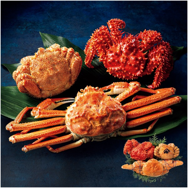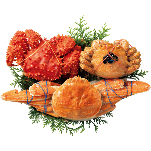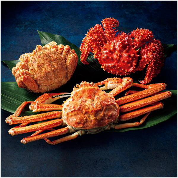 ボイル毛がに(北海道オホーツク海産原料)1尾(450g)、ボイル花咲がに(北海道産原料)1尾(500g)、ボイルおおずわいがに(北海道産原料)1尾(400g)