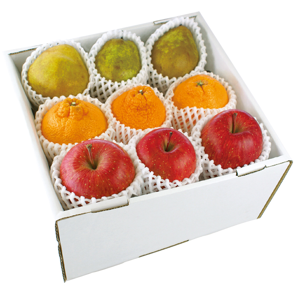 サンふじりんご3個(丸秀品、Lサイズ)、ラ・フランス3個(秀品、2Lサイズ)、デコポン3個(2Lサイズ)、計2.4kg以上