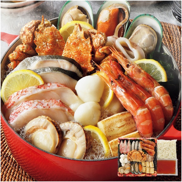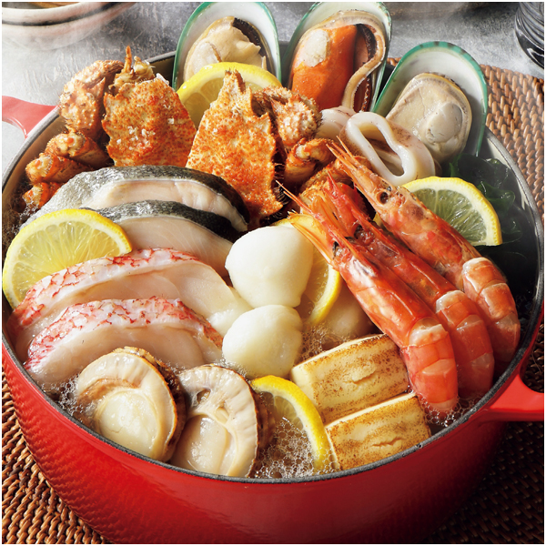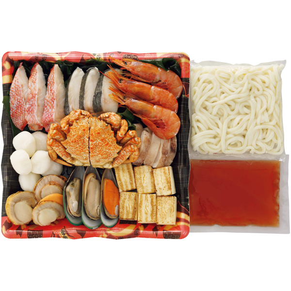 栗がにハーフカット170g、銀だら・キンキ 各20g×3、赤えび3(計90g)、パーナ貝片貝3(計90g)、ボイルほたて3(計80g)、白すり身団子6(計78g)、いか切身6(計40g)、焼き豆腐6(計120g)、わかめ100g、うどん200g、鯛だし塩トマトスープ155g