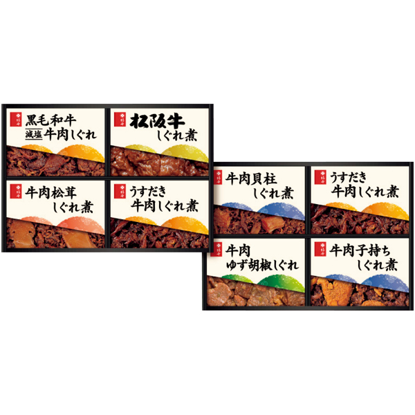 松阪牛しぐれ煮・うすだき牛肉しぐれ煮2・黒毛和牛減塩牛肉しぐれ・牛肉子持ちしぐれ煮・牛肉貝柱しぐれ煮 各50g、牛肉松茸しぐれ煮・牛肉ゆず胡椒しぐれ 各60g