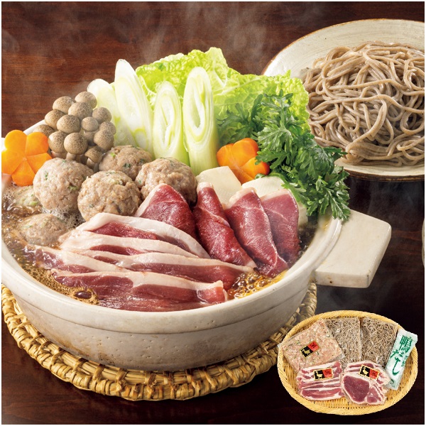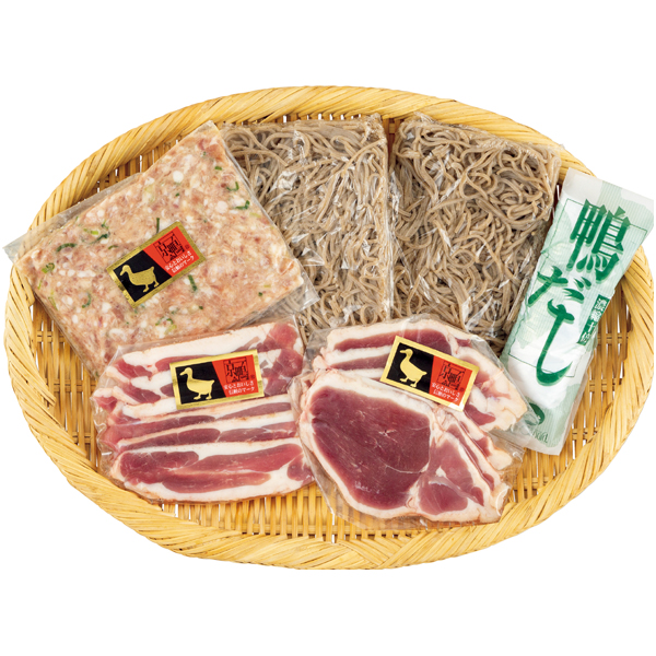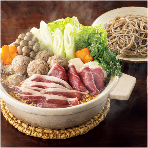 国産あい鴨肉(ロース(むね)120g、もも120g)、京鴨生つみれ(ネギ入り)130g(原料:肉/国産)、ゆでそば170g×2、鴨だし25ml×4