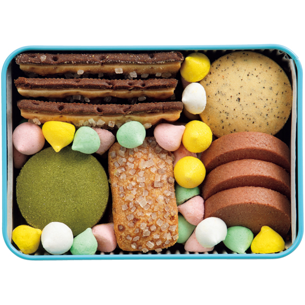 抹茶クッキー、アールグレイクッキー、ラズベリークッキー、パルメザンチーズクッキー、メレンゲ(ホワイト、ピンク、イエロー、グリーン)、パイクッキー 計155g 缶サイズ:9.9cm×13.9cm×4.8cm