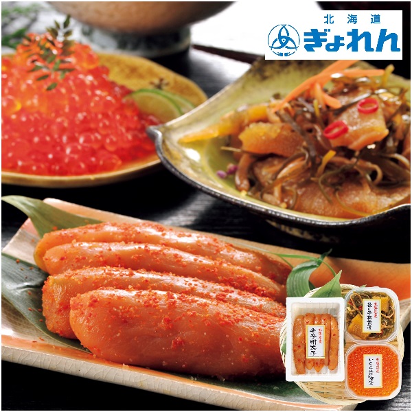 はぼまい昆布しょうゆで味付けしたいくら、無着色の辛子明太子、更に北海道産にしんの卵、するめいか、昆布を使用した数の子松前漬。北海道産にこだわった海鮮詰合せです。