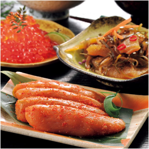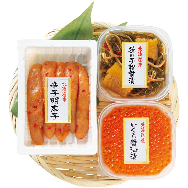 いくら醤油漬60g、辛子明太子(無着色)120g、数の子松前漬50g