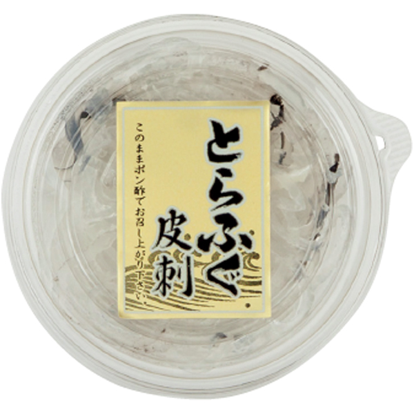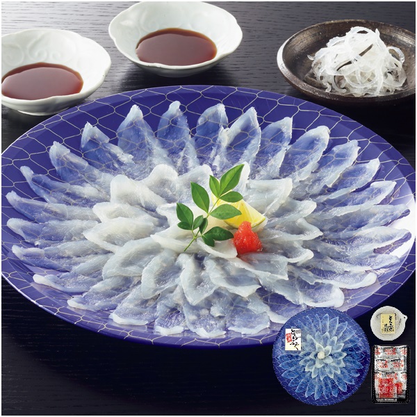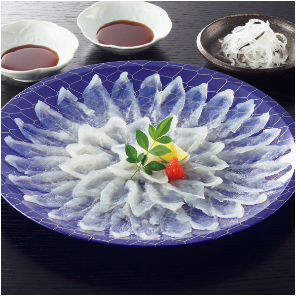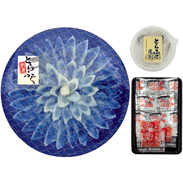 とらふぐ刺身65g(長崎県産養殖)、とらふぐ皮刺身20g(国産養殖)、ぽん酢15g・もみじおろし3g 各3