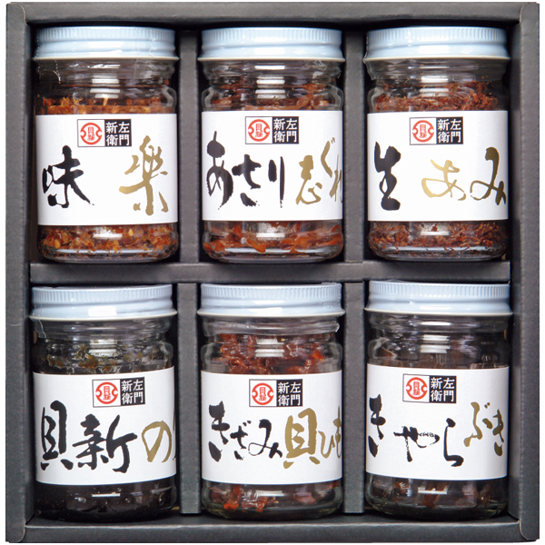 あさり志ぐれ75g、生あみ70g、味楽60g、きゃらぶき60g、きざみ貝ひも60g、貝新のり100g