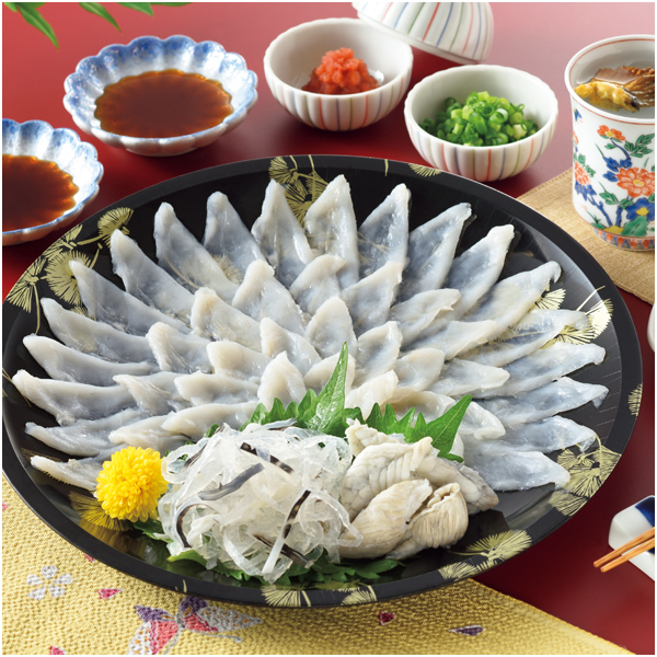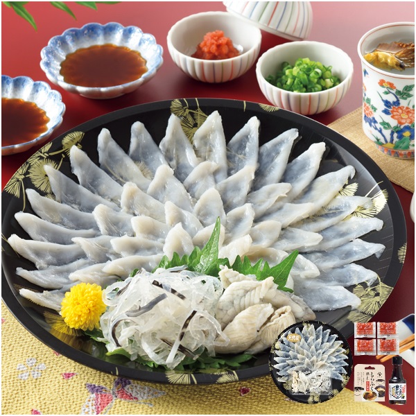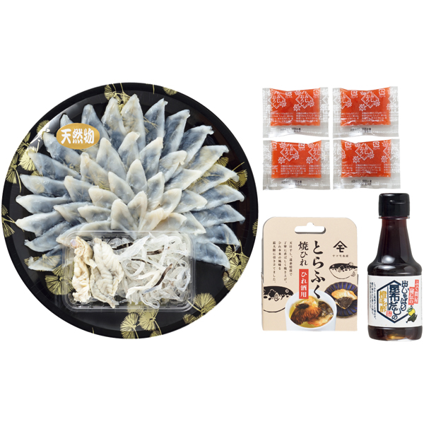 天然とらふぐ刺身70g、天然とらふぐ身皮50g、特製ポン酢150ml、もみじおろし10g×4、ひれ酒用とらふぐ焼きひれ5g