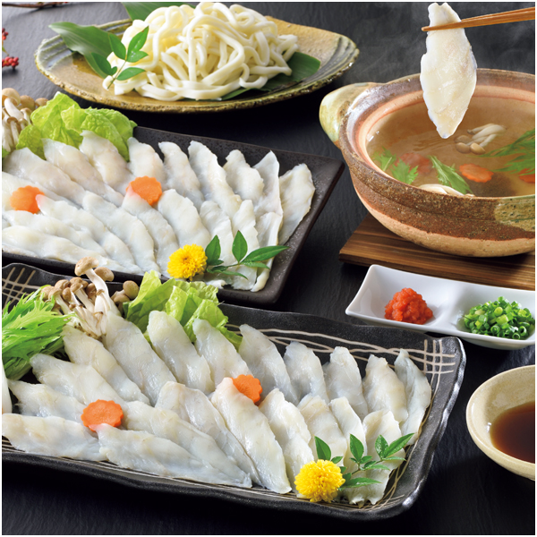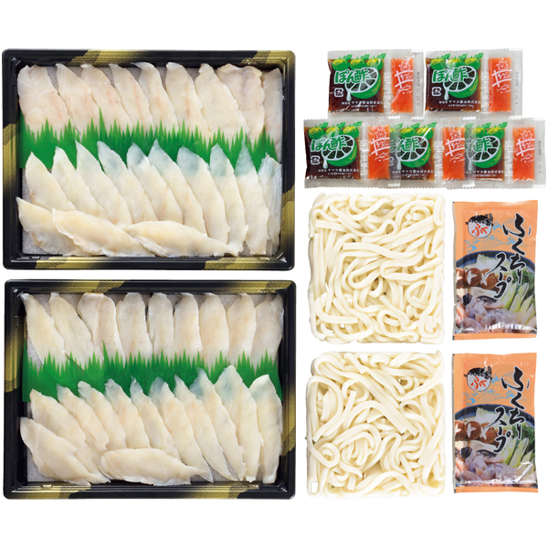 真ふぐしゃぶしゃぶ用切身190g×2、うどん玉200g×2、ふぐちりスープ60g(希釈用)×2、味付けポン酢14ml×5、もみじおろし3g×5