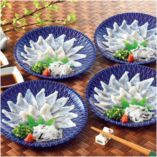 ふぐの本場下関より直送。日本海で水揚げされた国産真ふぐを使用し、職人の技術で一枚一枚丁寧に鮮やかに仕上げ、淡白な身質でありながらしっかりとした旨みと甘み、昆布エキスをふりかけたことで、色々な味わいをご家庭で堪能できる刺身セットとなっています。