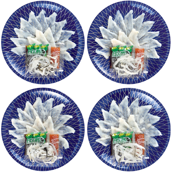 真ふぐ刺身25g(皮5g付き)×4、味付けポン酢14ml×4、もみじおろし3g×4