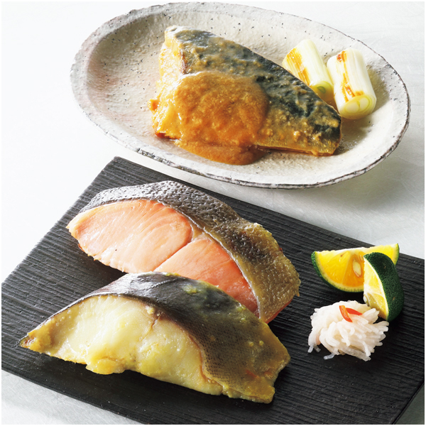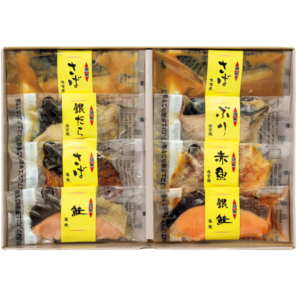 銀だら西京焼・銀鮭塩焼・鮭塩焼・鯖塩焼・赤魚西京焼・ぶり西京焼 各50g、鯖味噌煮50g×2 計8