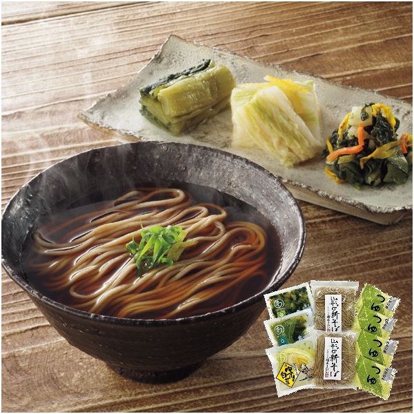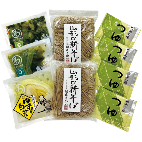 新そば(なまそば)(130g×2)2(山形県産新そば粉使用)、そばつゆ74g×4、ゆず白菜・青菜漬・おみ漬 各100g