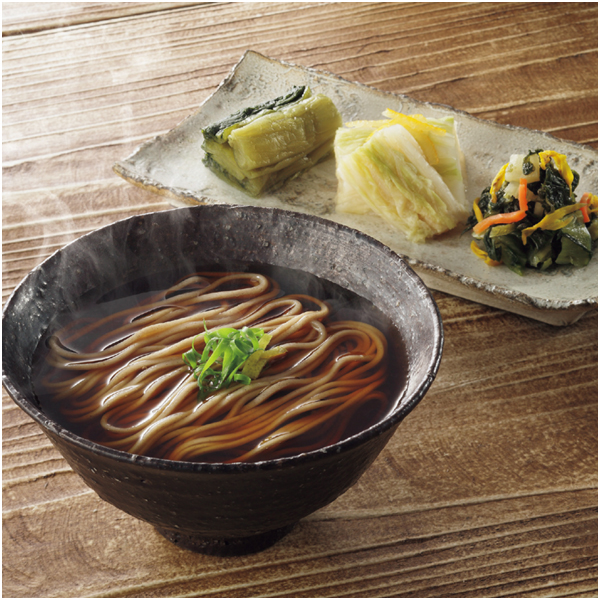 山形県産の新そば粉を使った風味豊かな新そばと、3種の漬物をセットにしました。