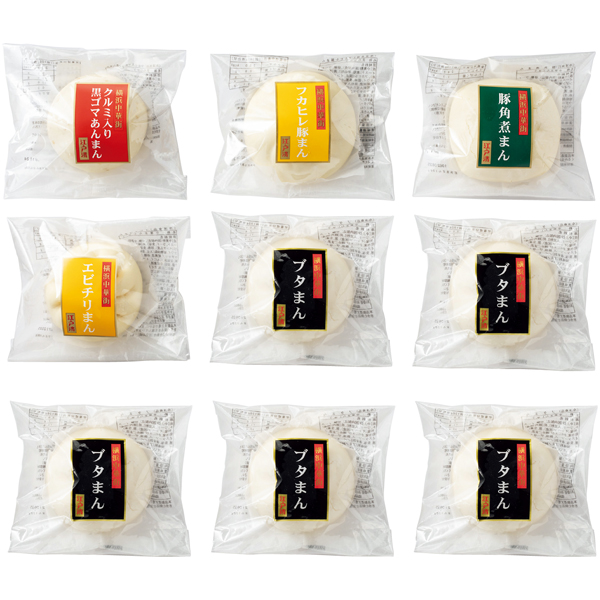 ブタまん120g×5、クルミ入り黒ゴマあんまん100g、フカヒレ豚まん100g、エビチリまん100g、豚角煮まん100g 計9