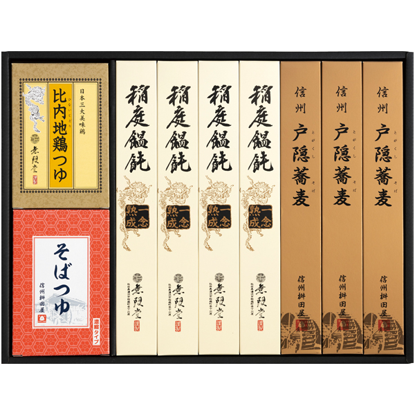 稲庭うどん80g×4、戸隠そば80g×3、比内地鶏つゆ30ml×4、そばつゆ25g×3