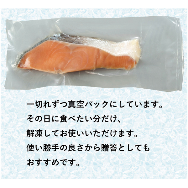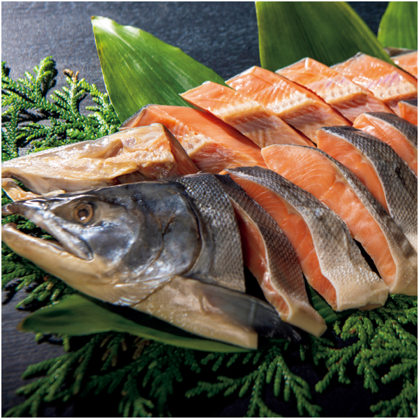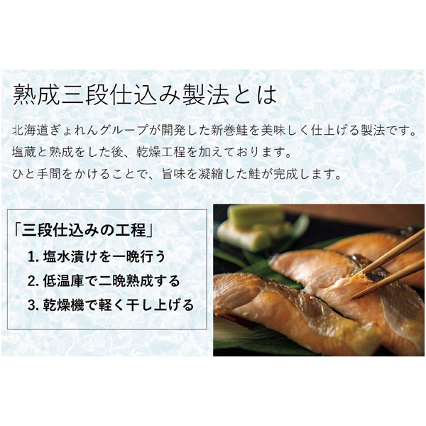 北海道産の秋鮭を塩水で約1日漬込み、低温で約2日間熟成。更に遠赤外線で軽く干し上げる三段仕込み製法で旨みを凝縮しました。
