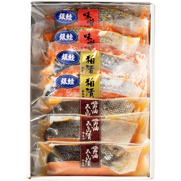 銀鮭の味噌漬(1切)2、銀鮭の粕漬(1切)2、秋鮭の醤油みりん漬(1切)3