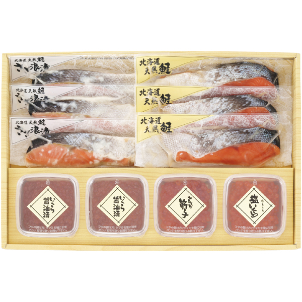 北海道鮭塩切身80g×3、北海道鮭さざ浪漬(鮭の塩糀漬)70g×3、いくら醤油漬60g×2、ひとくち筋子・塩いくら 各60g
