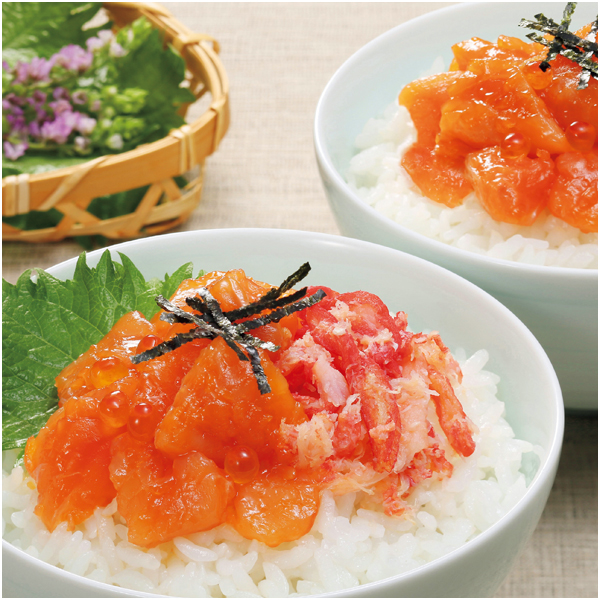 北海道産の鮭といくらの醤油漬(鮭ルイベ漬)と、北海道産の紅ずわい蟹入りの鮭ルイベ漬の、北海道産2種の海鮮丼詰合せです。