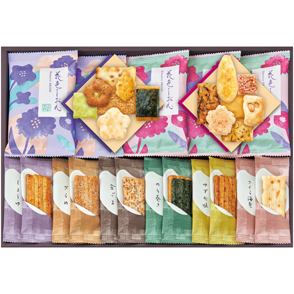 米菓詰合せ(藤紫5、薄紅6)、しょうゆ・ざらめ・金ごま・のり巻き・ゆず七味・さくら海老 各5