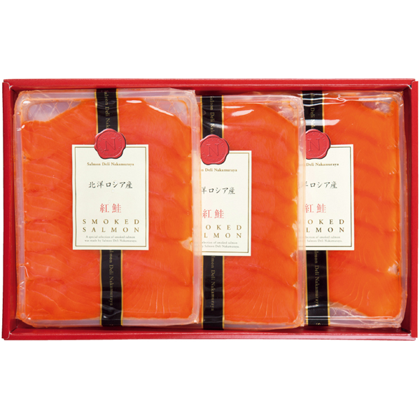 ロシア産天然紅鮭を中村屋独自の製法で仕上げたスモークサーモンのスライスセット。